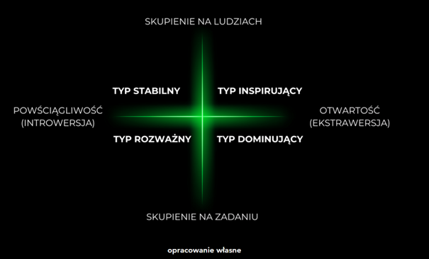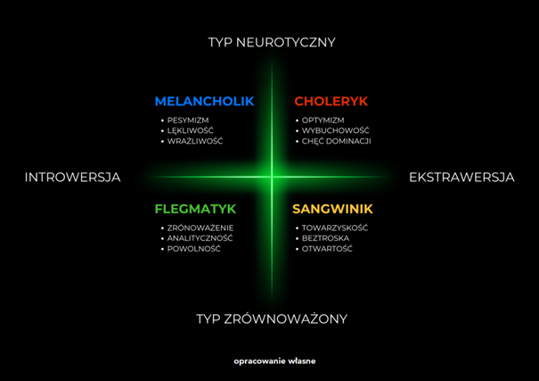 W psychologii wyróżnia się wiele modeli osobowości, ale dla potrzeb tego artykułu skupimy się na czterech głównych typach. To na nich opiera się większość modeli psychologicznych takich jak teoria kolorów i DISC. W dużym skrócie – osobowość każdego człowieka można umieścić na dwóch osiach. Pierwsza odpowiada za szybkość i intensywność reakcji na bodziec. Na tej podstawie można wyróżnić neurotyków, którzy charakteryzują się dużą lękliwością i emocjonalnością, i osoby zrównoważone emocjonalnie – reagujące spokojem. Drugą osią jest to, skąd człowiek czerpie energię potrzebną do działania. Można tu wyróżnić ekstrawertyków – czyli osoby, które „ładują akumulatory” podczas kontaktów z innymi ludźmi – oraz introwertyków, dla których najlepszą regeneracją jest chwila spędzona w samotności.